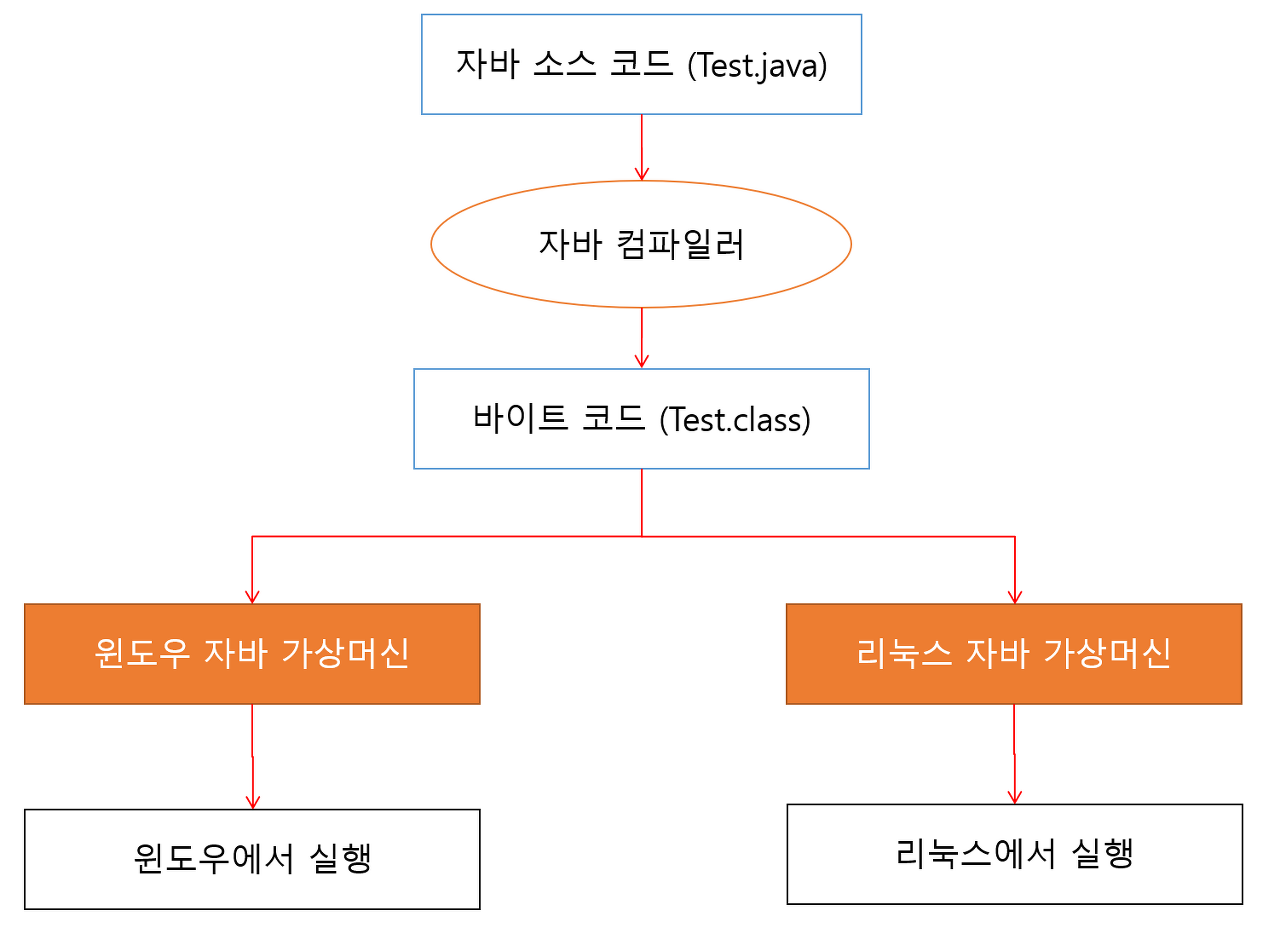 자바가상머신을 사용하는 가장 큰 이유는 하나의 바이트코드 즉 (.class)파일로 모든 플랫폼에서 작동이 가능해서 사용합니다