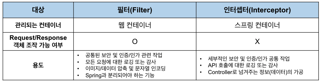 Interceptor는 J2EE의 표준 스펙인 Filter 와 다르게 Spring이 제공하는 기술로써, 디스패처 서블릿이 컨트롤러에 호출되기 전과 후에 요청과 응답을 참조하거나 가공할 수 있는 기능을 제공합니다.